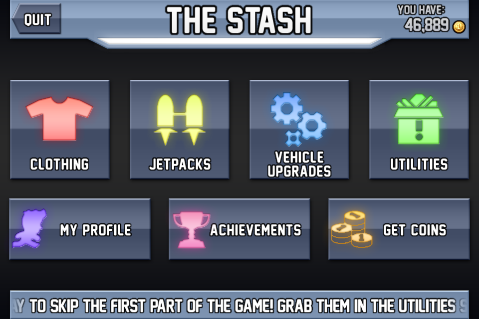 In the stash you can check out the clothing. The clothing has clothes which can be bought to be added on to your guy. The Jetpacks is where you can buy different jetpacks for your guy. For example, the one I have is a fruit jetpack. The Vehicle Upgrades is where you can upgrade vehicles. Vehicles in this game are special because they can fly, jump, teleport, change the gravity, or become a fierce dragon. The newest vehicle added is called Mr. Cuddles which is a dragon that spits out fire when you press on it. So they have 2 vehicle upgrades, a gold add-on and a coin magnet add-on. Gold just makes your vehicle turn gold and coin magnet makes all coins come to you when your near them. Utilities is where you can buy missions to skip. My Profile is where you check where you are in the game. Achievements are achievements you can get in the game. Get Coins is where you can buy coins to have more coins.